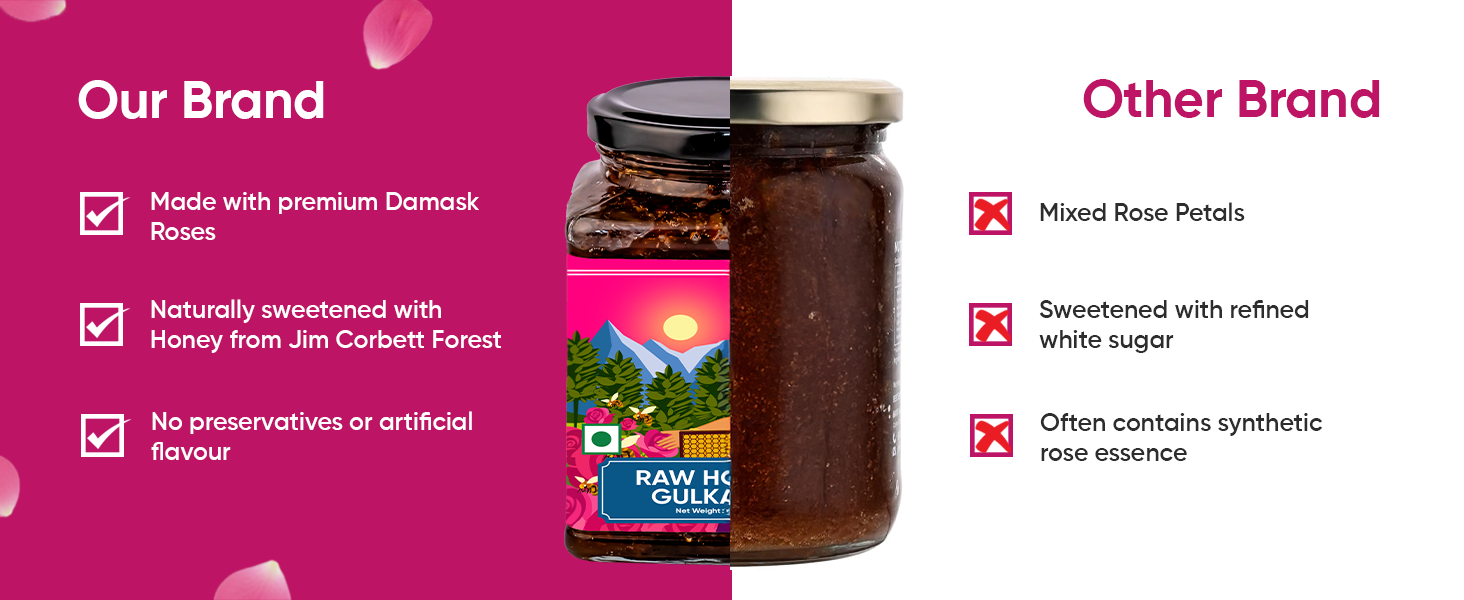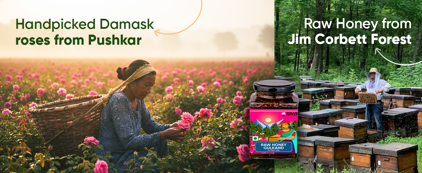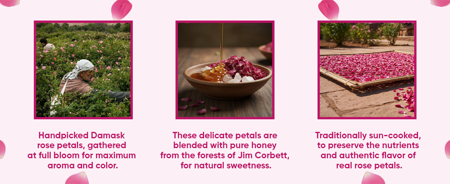 Damas Rose Honey Gulkand (500 gm): Crafted from raw honey infused with Damas rose petals and Mishri, this luxurious treat is packed with antioxidants and nutrients. ✅ A blissful blend of floral aroma and natural sweetness for rejuvenation and health.