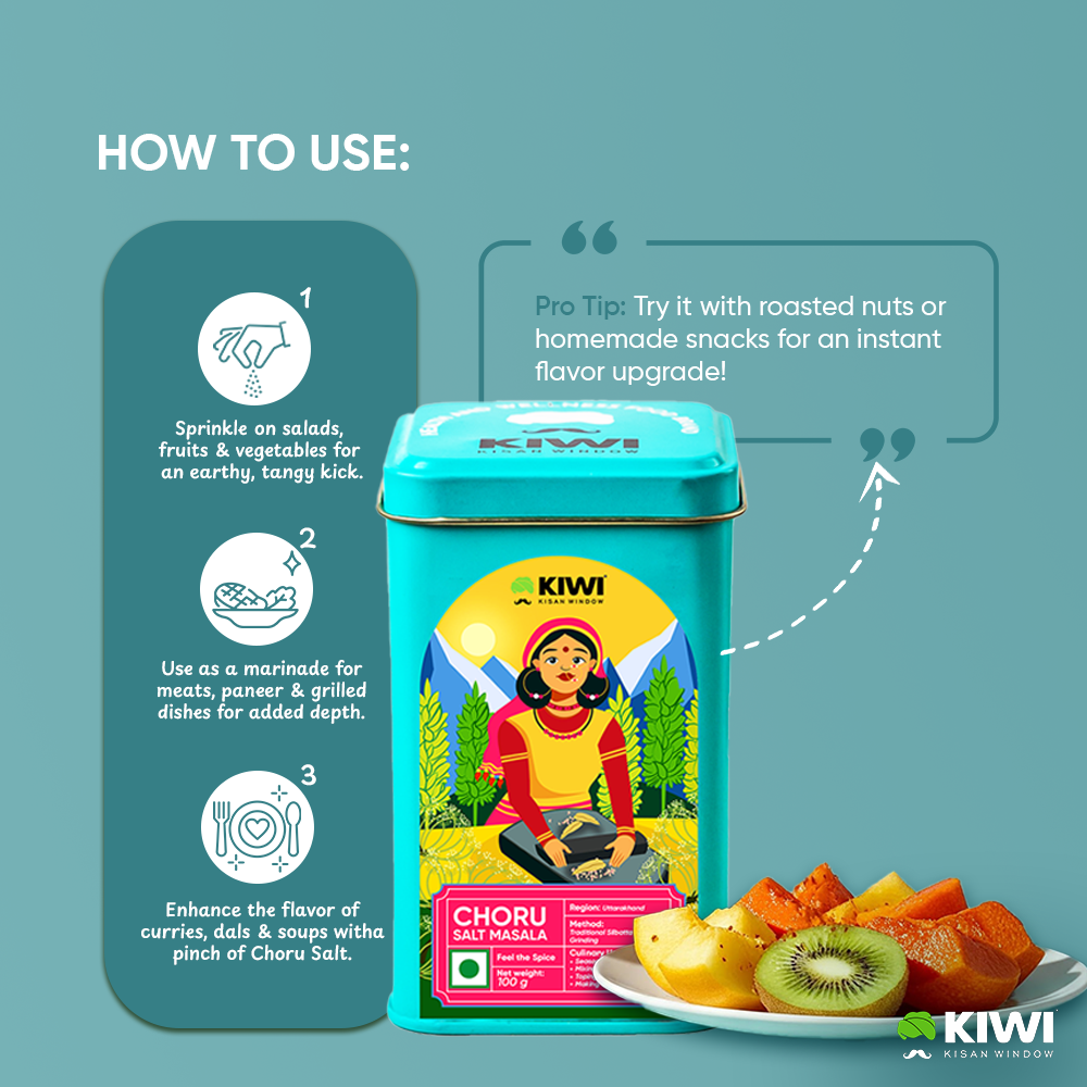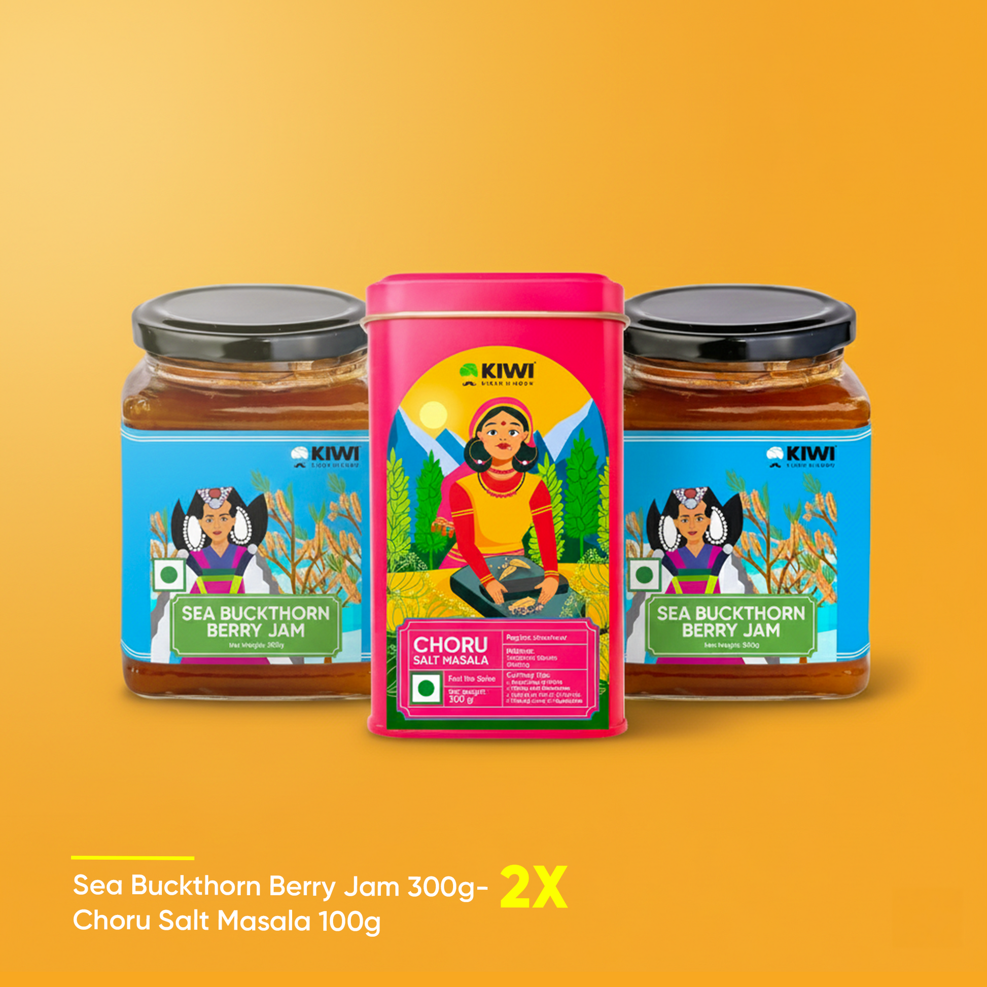 Bring home the bold and vibrant taste of the mountains with KIWI Kisan Window’s Himalayan Flavour Combo, featuring our aromatic Choru Masala Seasoning and tangy Sea Buckthorn Jam. This combo captures the essence of Himalayan cuisine - one adds a punch of earthy, smoky flavour while the other delivers bright, nutrient-rich sweetness.