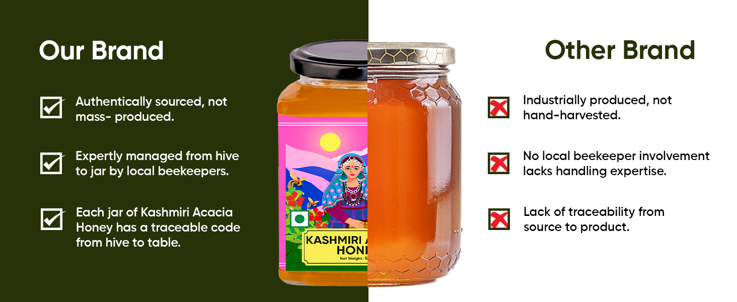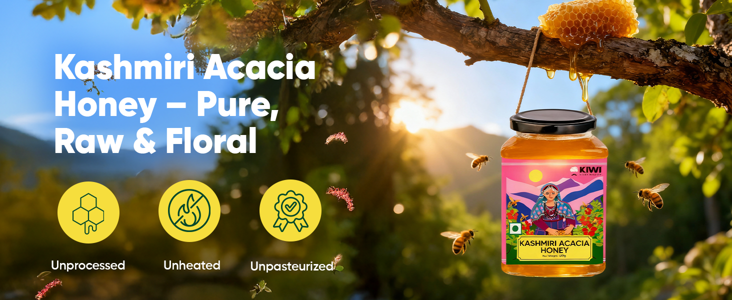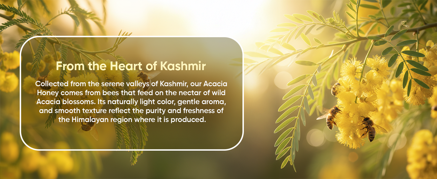 Sourced from the pristine valleys of Kashmir and the high-altitude Himalayan terrains, this duo blends mild sweetness with nutrient-rich tanginess for everyday wellness. Our Kashmir Acacia Honey is light, floral, and naturally soothing - perfect for detox drinks, teas, and daily immunity support.